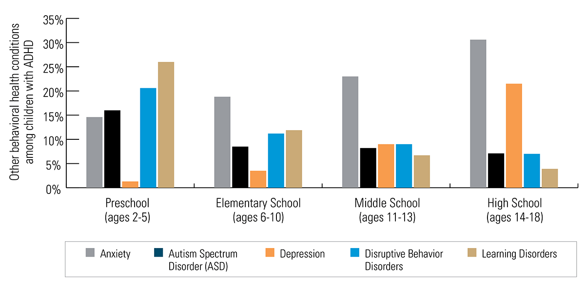 پس زمان طلایی درمان کودکان و استعدادیابی کودکان را از دست ندهید. در این قسمت می خواهیم توضیح دهیم که چرا زمان طلایی درمان بسیار مهم است. به اینفوگرافی زیر که نتیجه تحقیقات گسترده در حوزه بیش فعالی کودکان است توجه فرمائید. با گذشت زمان به نظر اختلال های رفتاری مخرب (disruptive behavior disorder)، اختلال یادگیری (Learning Disorder) و همچنین اختلال اوتیسم (Autism Spectrum Disorder) در کودکان کمتر بروز می کنند اما به نمودار اضطراب (Anxiety) و افسردگی (Depression) کودک توجه کنید، با گذشت زمان این موارد در کودک افزایش پیدا کرده اند. {منبع اینفوگرافی}